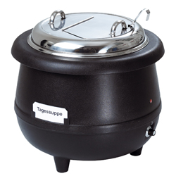 - Inhalt: 10 Liter - Außentopf Kunststoff schwarz - herausnehmbarer Einsatz aus CNS - Regelthermostat von 50 - 95 ºC - Dreh- und klappbarer Edelstahldeckel - mit Löffelaussparung und hitzeisoliertem Griff - Anschlusswert: 0,45 kW / 1 NAC 230 V - Maße: H 380 mm, Ø 390 mm - Inklusive Suppenkelle - Gewicht: 5,2 kg