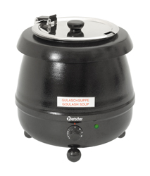 Partytopf - Außentopf schwarz, Stahlblech lackiert - herausnehmbarer Einsatz aus EdelstahlEnergieregler: 30 - 95 °C - mit dreh- und klappbarem - Edelstahldeckel, Löffelaussparung, - hitzeisolierter Griff - Inhalt: ca. 9,0 Liter - Maße: H 360 mm, Ø 345 mm - Anschlusswert: 0,4 kW / 230 V - inkl. 8 magnetisch haftender - Suppenbeschriftungen - Gewicht: 4,5 kg