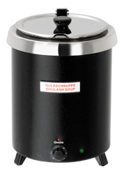 Suppentopf "CLUB" - Außentopf schwarz, Stahlblech lackiert - herausnehmbarer Einsatz aus Edelstahl - Energieregler: 30 - 95 °C - mit dreh- und klappbarem Edelstahldeckel - Löffelaussparung, hitzeisolierter Griff - Inhalt: ca. 8,5 Liter - Anschlusswert: 0,4 kW / 230 V - Abmessungen: H 385 mm, Ø 295 mm - inkl. 8 magnetisch haftender - Suppenbeschriftungen - Gewicht: 3,4 kg