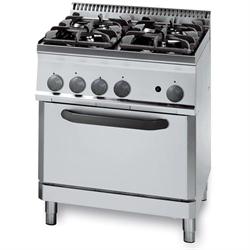Herd, Gas, 4 Brenner mit Elektro-Ofen - 4 Brenner: 1x 3,3kW + 2x 4,5kW + 1x 7,2 kW - Backkammer: 57,5x65x30cm = GN2/1 - Elektro-Ofen 5 KW Ober und Unterhitze - mit tiefgezogener Kochmulde - Edelstahlkorpus - Leistungsstarke Brenner: - Zündbrenner - Sicherheitsthermostate mit Thermoelementen - Abmessung in mm (B/T/H): 700X700X850 - Gas KW: 19,5 - Volt: 400 - Phasen: 3 - Gewicht: 94kg