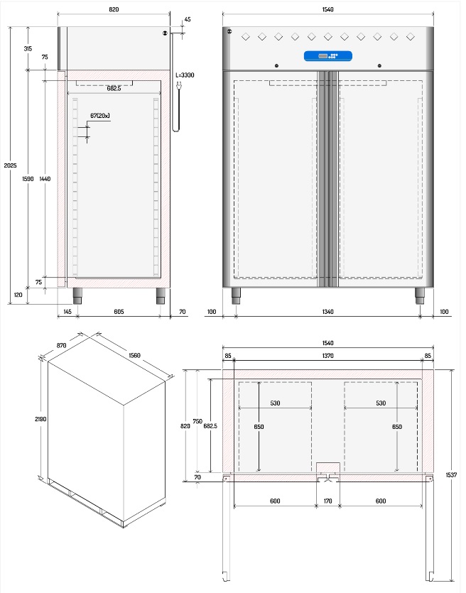 - Ausstattung: 3 Gitter GN 2/1 (530x650 mm) per Tür.