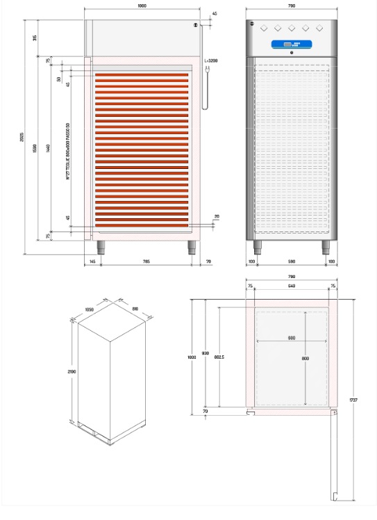- Elektronischer Mikroprozessor "Digital" (unter geschlossenem Gehäuse, 100% wasserdicht), mit Steuerung der Befeuchtung und Entfeuchtung, HACCP-Funktionen, Frontsteuerungsbildschirm mit blauer LED Lampe. Innenbeleuchtung mit Schalter.