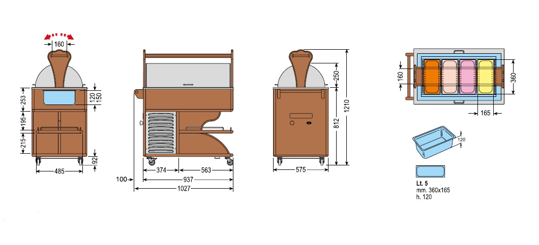 - Kapazität : 4 Behälter 360x165 mm, h.120 mm (5 L) od. 150 mm (7 L).