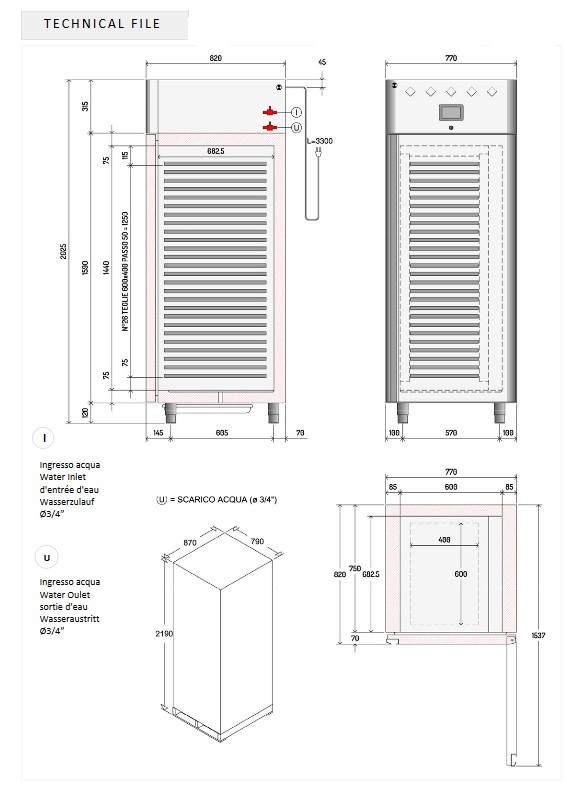 - Elektronischer Mikroprozessor "Digital" mit Anzeige fortschrittlicher Funktionen (unter geschlossenem Gehäuse, 100% wasserdicht), mit Steuerung der Befeuchtung und Entfeuchtung, HACCP-Funktionen, Frontsteuerungsbildschirm mit blauer LED Lampe. Innenbeleuchtung mit Schalter.