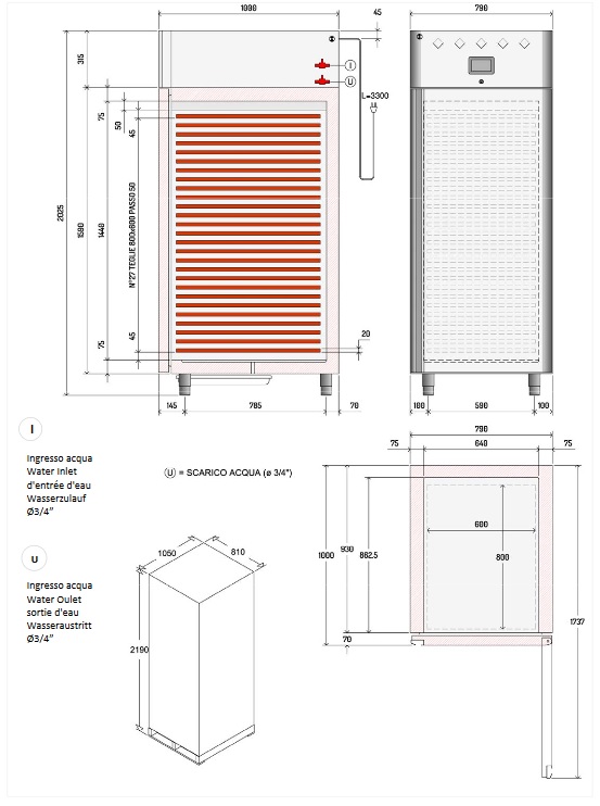 - Elektronischer Mikroprozessor "Digital" mit Anzeige fortschrittlicher Funktionen (unter geschlossenem Gehäuse, 100% wasserdicht), mit Steuerung der Befeuchtung und Entfeuchtung, HACCP-Funktionen, Frontsteuerungsbildschirm mit blauer LED Lampe. Innenbeleuchtung mit Schalter.