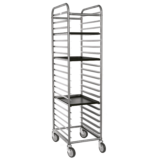 Transport-Tablettwagen für Bleche 20x 600x400 - Ausführung aus Edelstahl. - Auflageschienen, geschweißt, "L" Form. - Zwischenraum 75 mm. - Rohrrahmen 25x25 mm, demontierbar. - 4 Lenkräder Ø 125 mit Gummistopper und 2 mit Bremse mm (BxTxH) : 458x625xh1838 kg : 23 M³ : 0,29