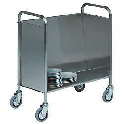 Transport-Abräumwagen - Röhrenstruktur aus Edelstahl AISI 304 (20x20 mm). - Geneigter Boden und Verkleidung aus Edelstahl AISI 304, Kapazität 200 Teller. - 4 Lenkrollen mit Anschlag, Ø 125 mm, 2 mit Bremsen. - Struktur demontierbar mm (BxTxH) : 840x480xh900 kg : 15 M³ : 0,4