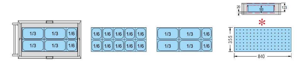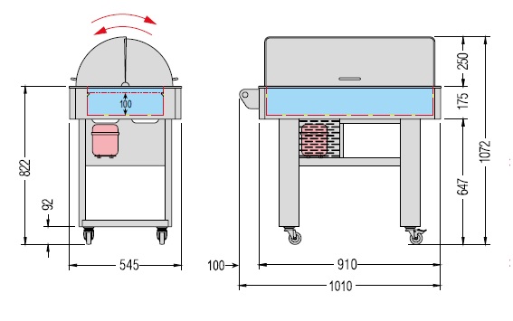 Buffetvitrine, gekühlter Wagen für Desserts - Möbelstruktur aus massivem Holz - Servierablage auf Schienen. - Gestell auf Rollen - Plexiglaskuppel. - Kapazität : 2x GN 1/6 und 4x 1/3, (h. 100 mm) - Becken aus Edelstahl AISI 304.