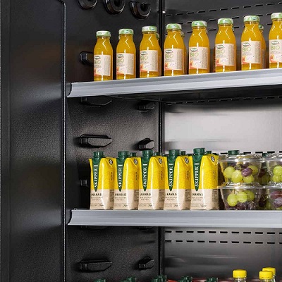 - 3 verstellbare Ausstellungsböden (340 mm) aus Edelstahl. Ausgestattet mit "Preishalter"-Leisten.