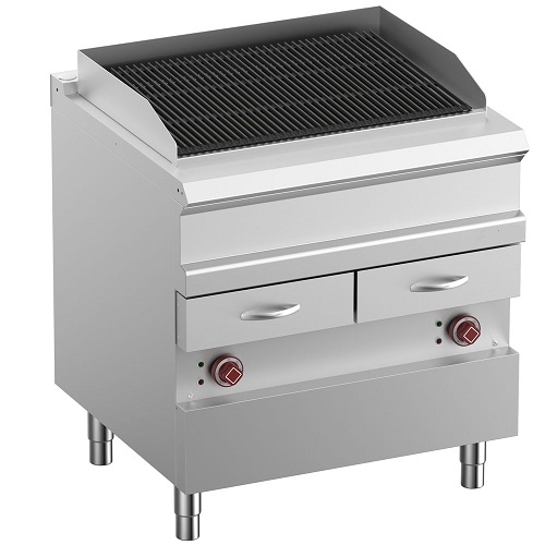 - Höhenverstellbares Grillrost. Auffangschublade für Bratflüssigkeit aus Edelstahl AISI 304 an der Vorderseite des Geräts.