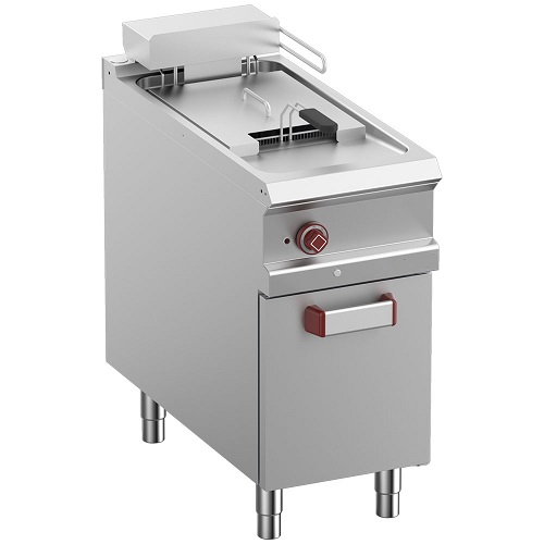 - Tiefgezogene Wanne aus Edelstahl AISI 304, abgerundete Innenecken, mit Kaltzone, Ablaufhahn (mit Kugel) im Schrank. Deckel aus rostfreiem Stahl. Wanne zum Absetzen des Öls, im Unterschrank verstaut.