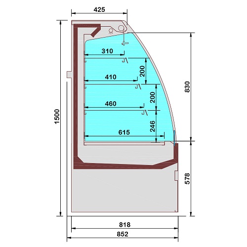 - Ausstellungstiefe 615 mm, Höhe 830 mm.
