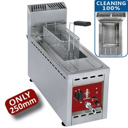 Die schmalste Gasfritteuse auf dem Markt und mit einem Brenner außerhalb des Tanks !!.... Ideal für frische oder gefrorene Pommes, Schmalzgebäck, panierter Fisch. Diese Fritteusen ermöglichen den Öl- und Energieverbrauch im kalten Bereich...Tank 100% zugänglich, einfache Wartung (Brenner außerhalb des Tanks)! Bauteile an der Frontseite zu erreichen, um einfach eingreifen zu können, ohne Entleerung des Tanks oder die Fritteuse umzudrehen.