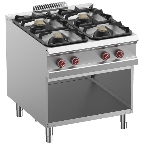 - Wasserdichte" Brenner aus Gusseisen, Krone aus Messing (sehr hoher Wirkungsgrad). Brennerregelung von 1,5 bis 7 kW und von 2 bis 11 kW über Gasventil, Zündung über Zündflamme und Sicherheit durch Thermoelement, Zugang von vorne für einfache Wartung. Emaillierte Gusseisenroste: 390x380 mm (spülmaschinenfest).