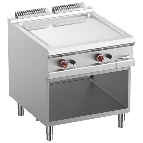 - Kochfeld aus Gusseisen (15 mm) mit hoher Wärmeleitfähigkeit, nach vorne geneigt und an 3 Seiten (3 mm) mit einer geschweißten Spritzschutzkante aus Edelstahl versehen, die eine perfekte Abdichtung garantiert. Eine Auffangschublade für Kochsaft befindet sich an der Vorderseite des Geräts.