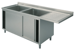 GLA0045 (24) M Edelstahl-Spülcenter 2 Becken links, Schiebetüren, Abtropffläche rechts und Aussparung, 200x70