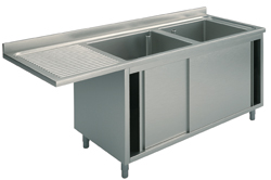 GLA0046 (24) M Edelstahl-Spülcenter 2 Becken rechts, Schiebetüren, Abtropffläche links und Aussparung, 200x70