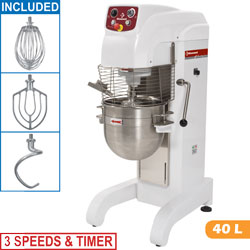 - Standardmäßig geliefertes Zubehör: Knetspirale, Besen, Rührer und Edelstahlbehälter mit 40 Lt.