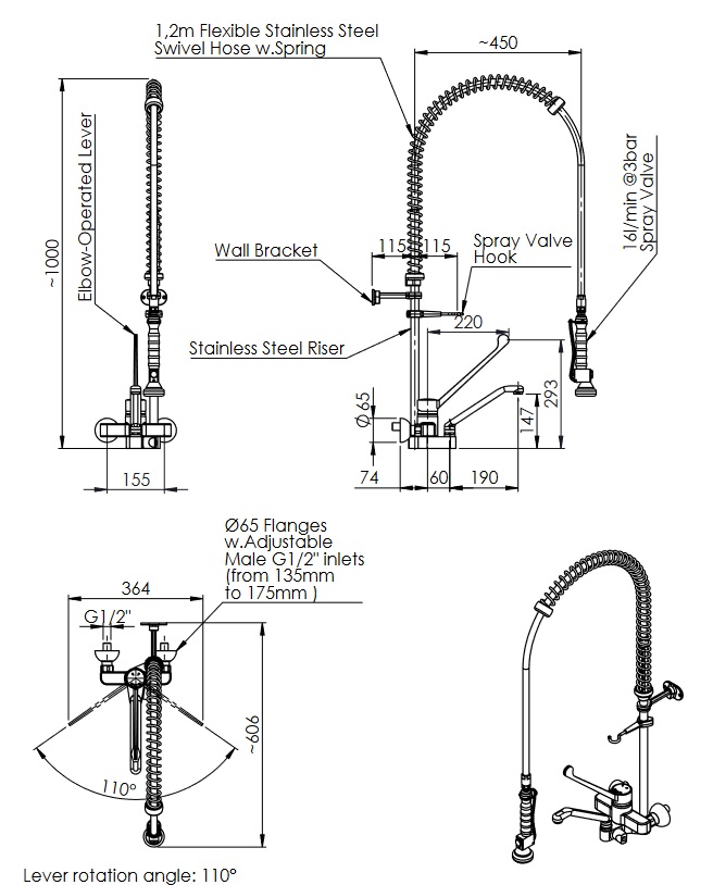 - Einlochmischbatterie mit Ellbogenbedienung, maximaler Wasserdurchsatz 16 l/min.
