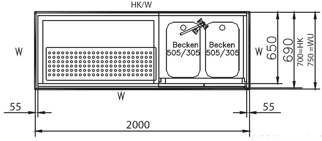Tiefgezogenem Nassbereich und Tropfmulde mit Ablaufverbindung.