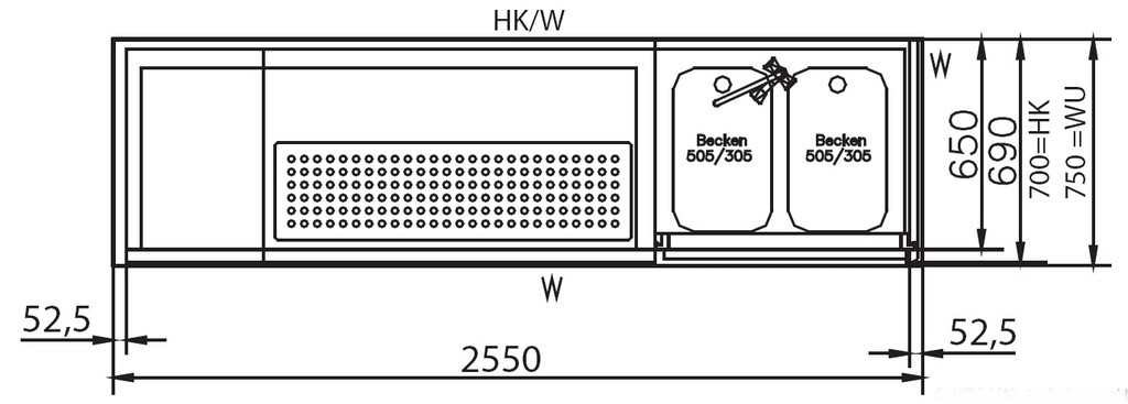 Tiefgezogenem Nassbereich und Tropfmulde mit Ablaufverbindung.