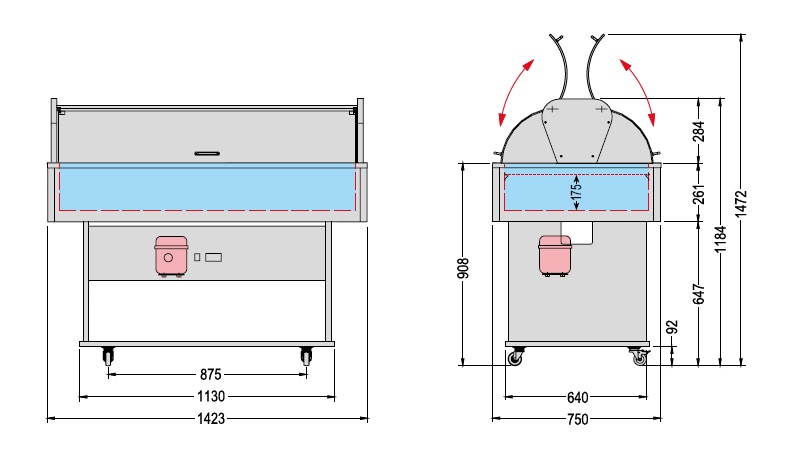 Buffetvitrine mit gekühlter Wanne - für 4GN 1/1 h=150mm - 2 hochklappbare Plexiglassabdeckungen - Massivholzausführung Melaminbeschtung Holz-Struktur - Kühlwanne aus Edelstahl - statische Kühlung - Auf 4 Rädern - Temperatur: +4°C bis +10°C - Kältemittel: R290a - Optional Tablettrutschen - Abmessung in mm (B/T/H): 1423x750x1472 - Volt: 230 - KW: 0,200 - HZ: 50 - Phasen: 1 - Gewicht: 125kg