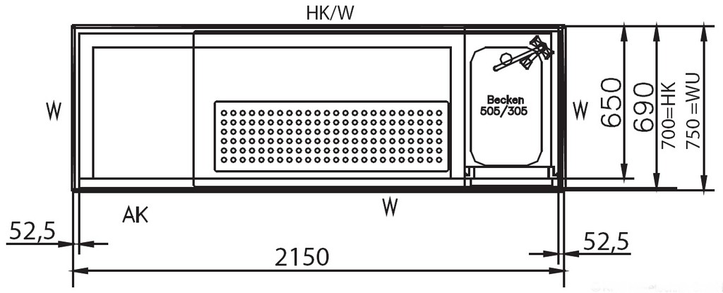 Tiefgezogenem Nassbereich und Tropfmulde mit Ablaufverbindung.