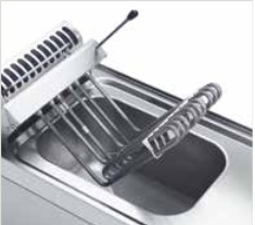 Fritteuse, elektro, Tischgerät 15kW mit 2 Becken 8+8lt. - Edelstahlkorpus - Ölbecken mit abgerundeten Ecken & Kaltzone - mit Ablasshahn - Heizelemente zum Hochkippen je 6kW - Hochgezogene Kanten als Überlaufschutz - Sicherheitsthermostat - Abmessung in mm (B/T/H): 700X700X280 - Volt: 400 - KW: 15 - HZ: 50/60 - Phasen: 3 - Gewicht: 31kg Unterschrank unter Zubehör