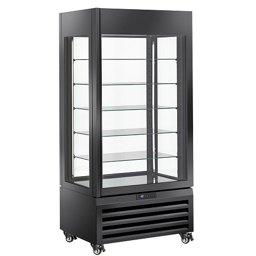 - 5 höhenverstellbare Glasböden (730x463 mm) auf AISI 304 Edelstahlträgern.