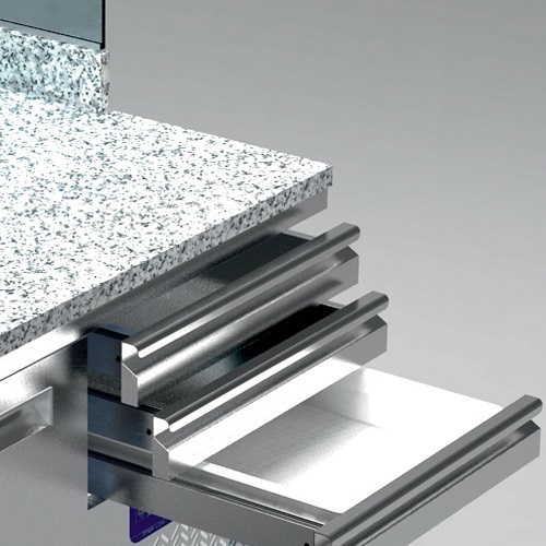 - Gestanzter Innenboden mit Abflussöffnung (größere Wartungsarbeiten), abgerundete Ecken, Leisten und Schienen aus Edelstahl.