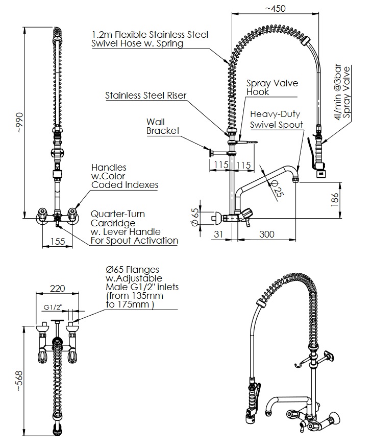 - Bedienerfreundliche Knebel- Zweiloch-Wandmontage mit einem Lochabstand von 135 bis 175 mm