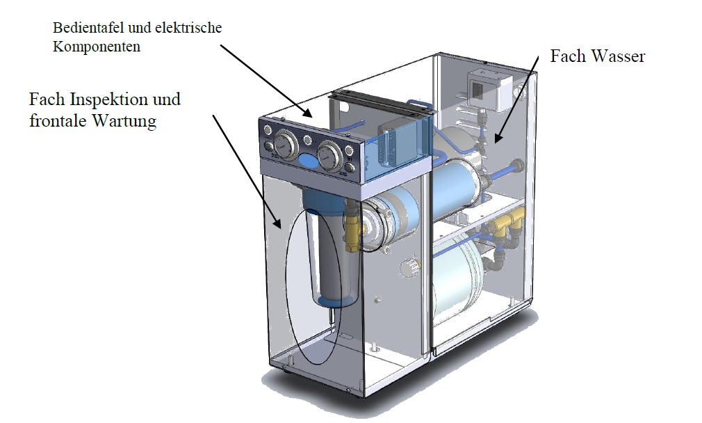 - 3 separate Bereiche: die Hydraulik, Wartungsbereich (vorne) und die Elektronik.