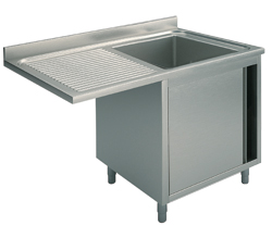 SLA1LS12070 (24) M Edelstahl-Spülcenter 1 Becken rechts, Flügeltür, Abtropffläche links und Aussparung, 120x70