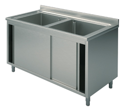 Spülschrank mit 2 Becken und Schiebetüren - mit 100mm Aufkanntung- Grundboden- höhenverstellbare Füße- Beckengröße 600x500mm- inkl. Standrohrventiel- Abmessung L1600 D700 H850mm- Gewicht 70kg