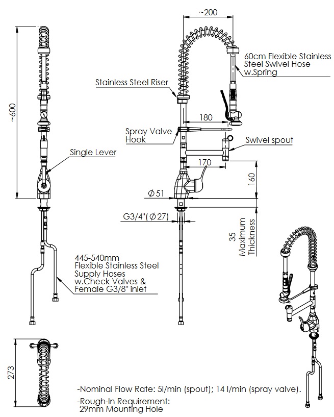 - Geschirrwaschbrause mit Einlochbatterie und Edelstahl Schwenkhahn