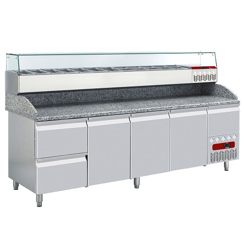 Pizzakühltisch inkl.Kühl-Aufsatzvitrine Kühlaufsatz GN 12x 1/4, 1x 1/9