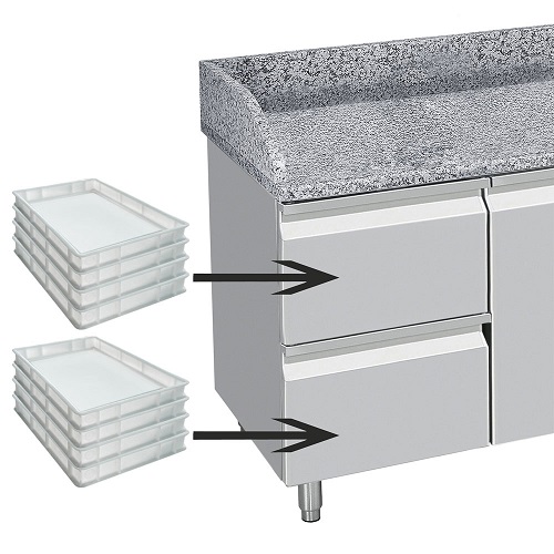 - 2 neutrale Schubladen auf Teleskopschienen ( Kapazität 2x 2 Behälter 600x400+ 4x Behälter = total 8) Maximalhöhe der Behälter (70 mm) .