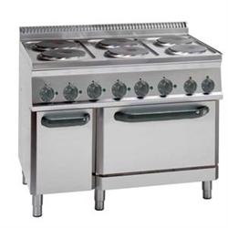 Herd, elektro, 6 Platten, rund, 20,6 kW mit Elektro-Umluftofen, 5kW - Backkammer: 53x65,5x30cm = GN2/1 - GN 1/1 Umluft-Backofen 5KW - mit tiefgezogener Kochmulde - Edelstahlkorpus - Hochgezogene Kanten als Überlaufschutz - 7-stufiger Energieregler für jede Platte - 6 Platten: 22cm mit 2,6 kW - Abmessung in mm (B/T/H): 1050X700X850 - Volt: 400 - KW: 20,6 - HZ: 50/60 - Phasen: 3